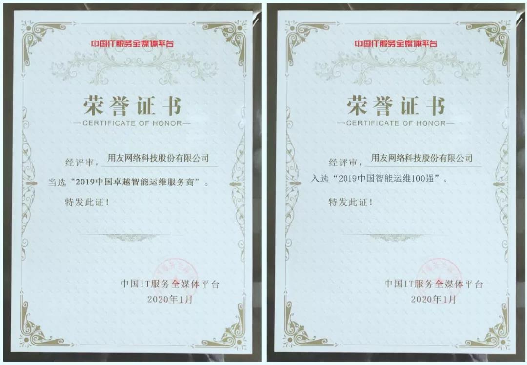 【榮譽(yù)】用友喜獲 2019中國IT服務(wù)領(lǐng)軍企業(yè)和智能運(yùn)維服務(wù)商兩項(xiàng)大獎